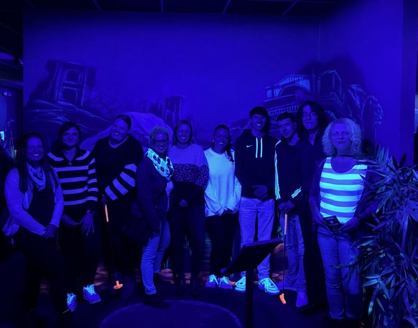 Wir, die Azubis aus dem Propsteiverband Ostfalen (Laura u. Marlon; Jennifer war leider abwesend an diesem Tag) waren gemeinsam mit den Azubis aus dem Landeskirchenamt und dem Propsteiverband Braunschweiger Land lecker essen und hatten ein aufregendes Indoor-Minigolf-Erlebnis bei den Schwarzlichtlöwen.